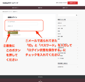 メールで送られてきた「ID」と「パスワード」を入力し、「ログイン状態を保存する」にチェックを入れて「会員ログイン」ボタンを押してください。